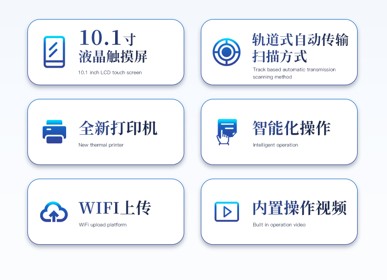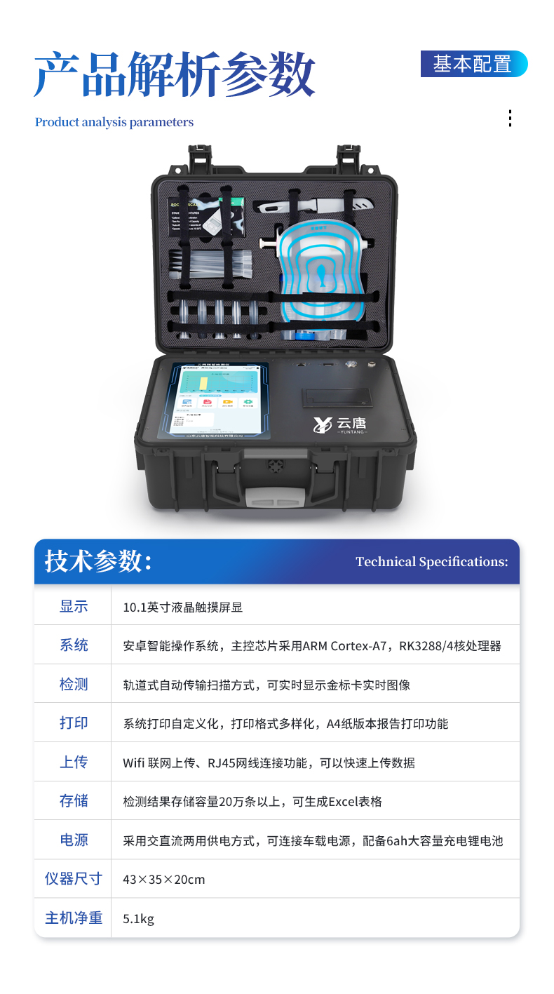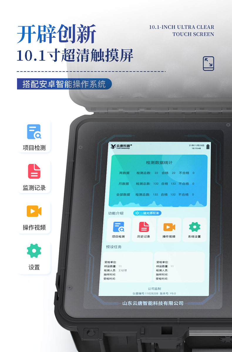| 1、儀器采用10.1英寸液晶觸摸屏顯,搭配運(yùn)行安卓智能操作系統(tǒng),主控芯片采用ARM Cortex-A7,RK3288/4核處理器,主頻1.88Ghz,運(yùn)轉(zhuǎn)速度更快速,性能更強(qiáng)。 | 2、儀器功能包括:膠體金檢測模塊、數(shù)字化管理模塊、無線通訊模塊等,可以滿足同一軟件下實現(xiàn)所有檢測項目的檢測,并在同一窗口展示檢測結(jié)果。 | 3、一體化便攜式快檢設(shè)備,采用交直流兩用供電方式,可連接車載電源,配備6ah大容量充電鋰電池,可以滿足現(xiàn)場及流動檢測使用的需求。儀器尺寸:43×35×20cm, 主機(jī)凈重:5.1kg | 4、系統(tǒng)自帶數(shù)據(jù)集成模塊,設(shè)備首頁自動統(tǒng)計檢測數(shù)據(jù)包含:周檢測數(shù)據(jù)、月檢測數(shù)據(jù),全部檢測總數(shù)量,均包含檢測總數(shù),合格數(shù),不合格數(shù),以及相關(guān)柱形分析圖,對各項檢測數(shù)據(jù)清晰掌握,無需電腦查詢,更加快捷直觀。 | 5、儀器具有任務(wù)預(yù)設(shè)模塊,可在樣品送檢前提前預(yù)設(shè)樣品名稱、檢測指標(biāo)、送檢單位等信息,樣品送檢時一鍵調(diào)取保存信息,檢測更加方便快捷。 |