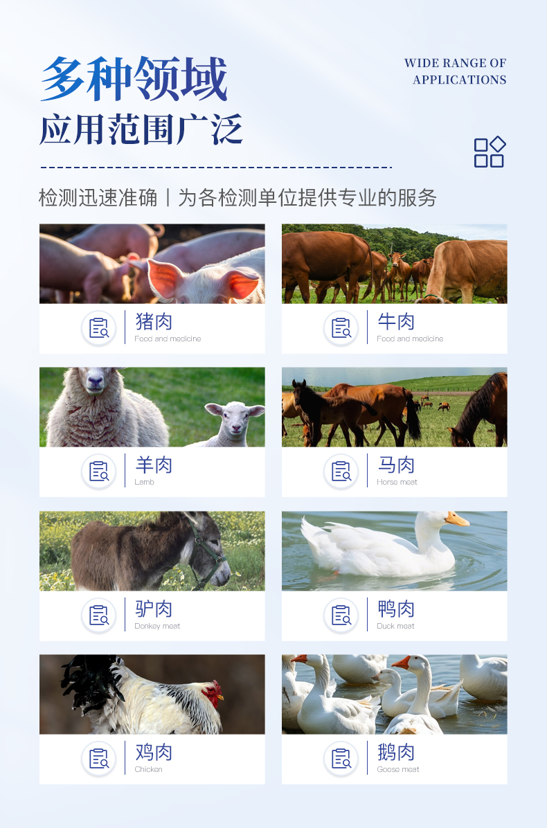 該儀器是一款**、便捷的食品檢測設(shè)備,專為識別肉類的真假而設(shè)計。可以對豬肉、牛肉、羊肉、馬肉、驢肉、鴨肉、雞肉、鵝肉等各種動物源性進(jìn)行檢測。能夠迅速、準(zhǔn)確地檢測肉類及肉源性種類,確保所食用的肉類真實可靠。檢測迅速準(zhǔn)確,為各檢測單位提供專業(yè)的服務(wù)。