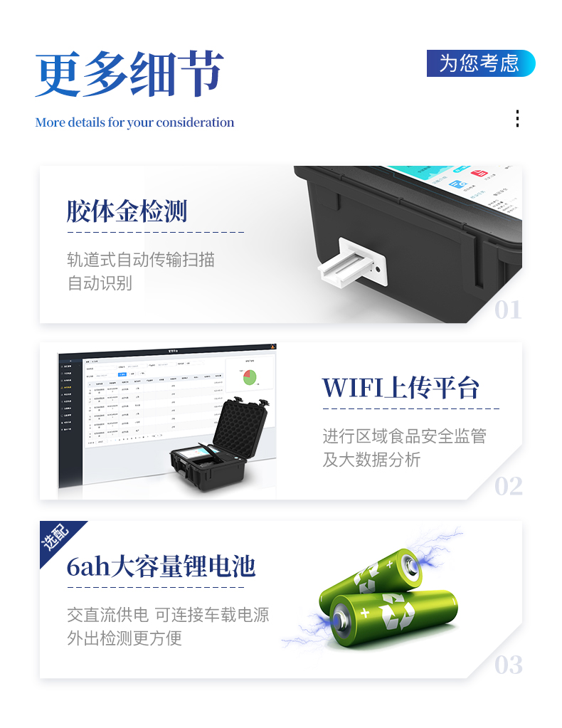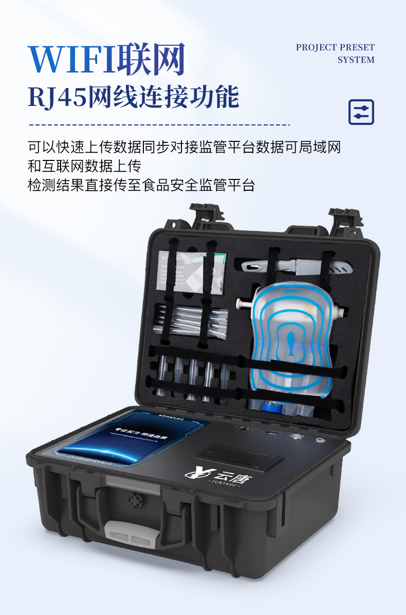 7、圖像調(diào)整功能:可根據(jù)金標(biāo)卡讀取圖像進(jìn)行多方位調(diào)整,使其更精準(zhǔn)讀取結(jié)果。 | 8、儀器檢測系統(tǒng)擁有龐大數(shù)據(jù)庫,并且構(gòu)建了完善的檢索、修訂功能。食品庫涵蓋多種樣品名稱,可按需添加或刪除、編輯樣品名稱;產(chǎn)品數(shù)據(jù)庫以及歷史檢測記錄支持一鍵檢索功能。 | 9、系統(tǒng)打印自定義化,打印格式多樣化,產(chǎn)品合格證(國家標(biāo)準(zhǔn)要求),二維碼,抽樣信息、檢測信息,受檢信息、復(fù)核信息、抽樣日期、檢測日期等信息結(jié)果,可按需求自行設(shè)置打印內(nèi)容。 | 10、A4紙版本報告打印功能:設(shè)備擁有兩種結(jié)果展示方式,可以自動生成A4打印模板和小票打印模板兩種樣式,可通過WiFi及網(wǎng)線等方式鏈接外置打印機(jī)可進(jìn)行打印 | 11、儀器具有 wifi 聯(lián)網(wǎng)上傳、RJ45網(wǎng)線連接功能,可以快速上傳數(shù)據(jù)。同步對接監(jiān)管平臺,數(shù)據(jù)可局域網(wǎng)和互聯(lián)網(wǎng)數(shù)據(jù)上傳,檢測結(jié)果直接傳至食品安全監(jiān)管平臺。進(jìn)行區(qū)域食品安全監(jiān)管及大數(shù)據(jù)分析處理與數(shù)據(jù)統(tǒng)計,檢測區(qū)域食品安全長短期動態(tài),達(dá)到食品安全問題預(yù)估、預(yù)警。 | 12、設(shè)備支持U盤存儲,標(biāo)準(zhǔn)USB接口,免驅(qū)動安裝。檢測結(jié)果存儲容量20萬條以上,可生成Excel表格,進(jìn)行一鍵拷貝,并具有登錄保護(hù)功能,可設(shè)置用戶名及密碼,規(guī)范不同人員操作權(quán)限,防止非工作人員操作,并且可以進(jìn)行重新校準(zhǔn)、鎖定、恢復(fù)出廠設(shè)置功能。儀器固件可升級,后期檢測項目可擴(kuò)充。 | 13、儀器具備遠(yuǎn)程升級功能,可定向分客戶分儀器更新,開機(jī)后自動更新,并可持續(xù)性免費(fèi)更新系統(tǒng)版本,無需像傳統(tǒng)產(chǎn)品返廠更新,節(jié)省時間及人力成本并避免了物流運(yùn)輸返廠升級導(dǎo)致設(shè)備損壞的潛在風(fēng)險。 |