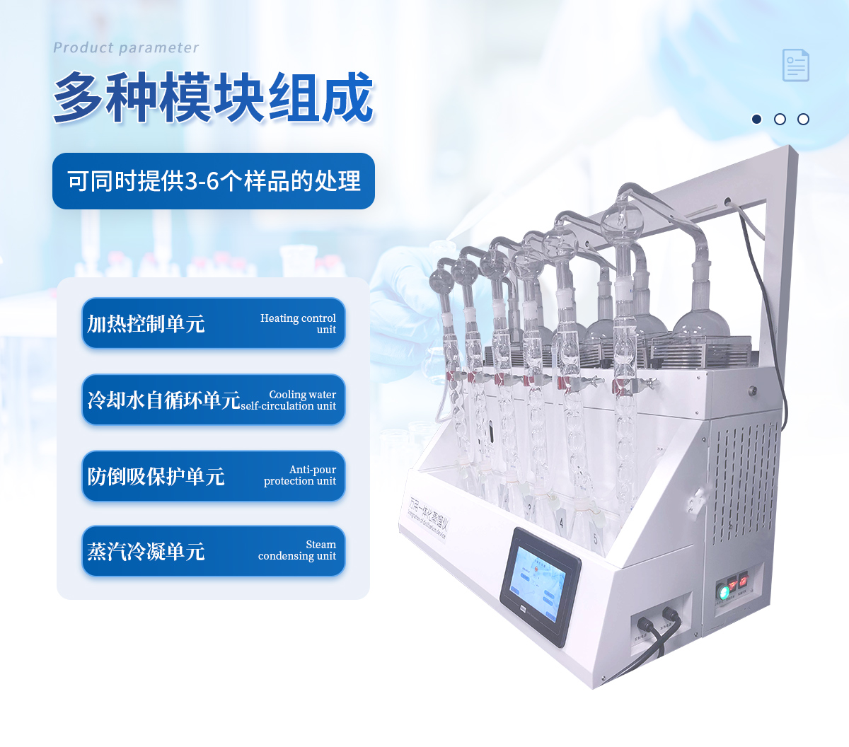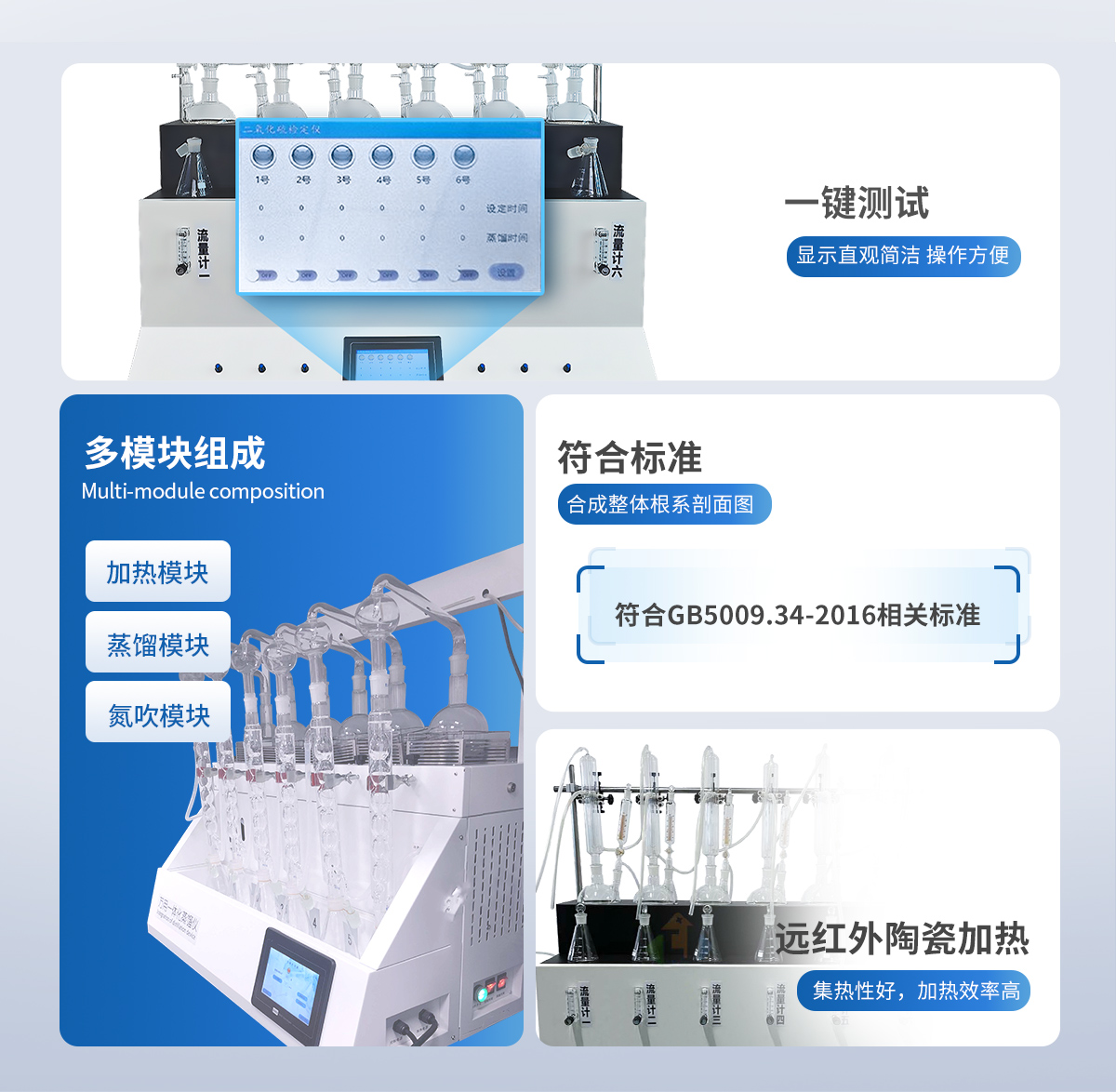 主要原理是根據(jù)藥典中所提供的檢測方法,將中藥材以蒸餾法進行處理,樣品中的亞硫酸鹽系列物質(zhì)加酸處理后轉(zhuǎn)化為二氧化硫后,隨氮氣流帶入到含有雙氧水的吸收瓶中,雙氧水將其氧化為硫酸根離子,采用酸堿滴定法測定,計算藥材及飲片中的二氧化硫殘留量。本產(chǎn)品在嚴格遵循藥典要求的基礎(chǔ)上,整合加熱,蒸餾,水循環(huán)及氮吹等功能為一體,可同時提供3-5個樣品(空白樣,平行樣)的處理,從而極大的提高了檢測數(shù)據(jù)的精度和減少了工作時間。