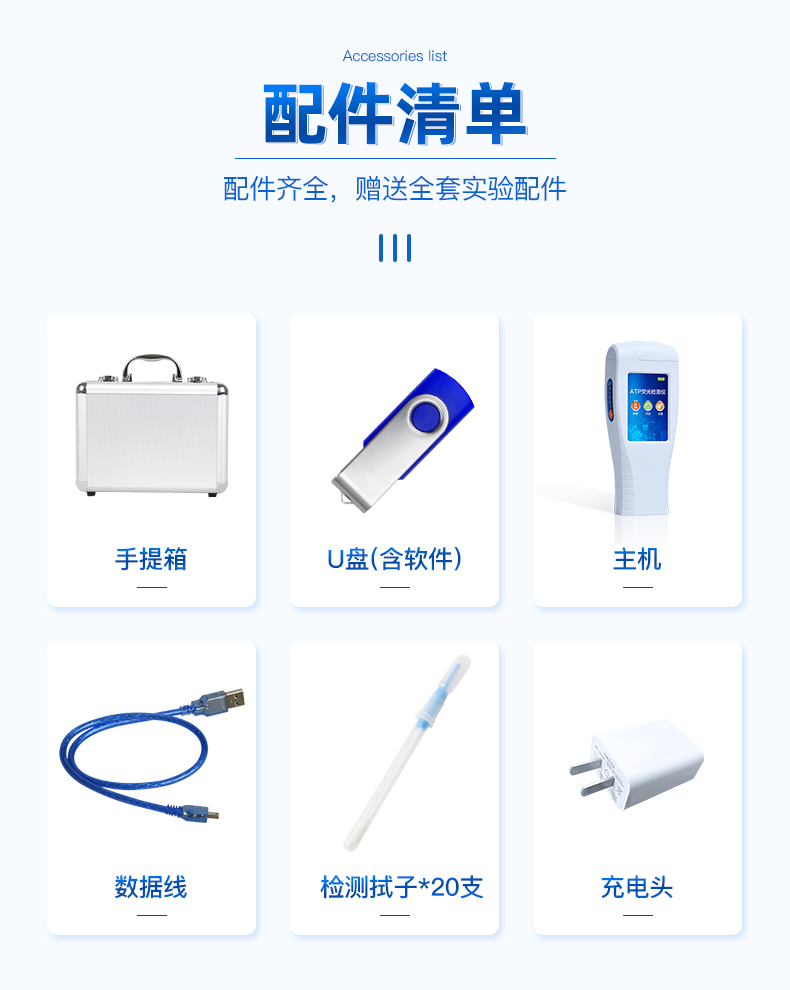 隨機配置:ATP熒光檢測儀(手持)主機、鋁合金手提箱、驅(qū)動U盤、儀器包、掛繩、PC數(shù)據(jù)線、數(shù)據(jù)分析軟件、中文操作手冊