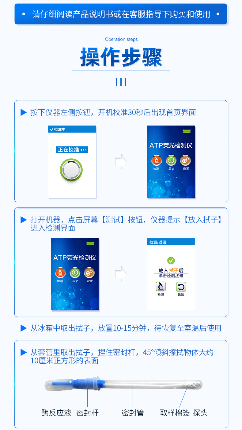 該設(shè)備為全新升級產(chǎn)品,大屏幕觸摸顯示屏,代替?zhèn)鹘y(tǒng)按鍵。操作采用生物化學(xué)反應(yīng)方法檢測ATP含量,ATP熒光檢測儀基于螢火蟲發(fā)光原理,利用“熒光素酶—熒光素體系”快速檢測三磷酸腺苷(ATP)。ATP拭子含有可以裂解細胞膜的試劑,能將細胞內(nèi)ATP釋放出來,與試劑中含有的特異性酶發(fā)生反應(yīng),產(chǎn)生光,再用熒光照度計檢測發(fā)光值,微生物的數(shù)量與發(fā)光值成正比,由于所有生物活細胞中含有恒量的ATP,所以ATP含量可以清晰地表明樣品中微生物與其他生物殘余的多少,用于判斷衛(wèi)生狀況。