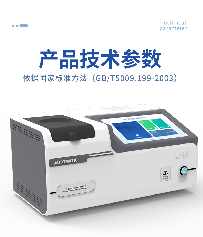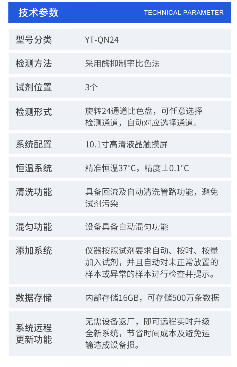 | 1. 試劑位置:3個 | 2. 檢測形式:旋轉24通道比色盤,可任意選擇檢測通道,自動對應選擇通道。 | 3. 系統配置:10.1寸高清液晶觸摸屏,采用ARM Cortex?-A7,RK3288/4核處理器,運行內存1GB。Android7.1.1 系統分辨率1280×800。 | 4.恒溫系統:具有自動加溫溫控系統,精準恒溫37℃,精度±0.1℃。 | 5.添加系統:儀器按照試劑要求自動、按時、按量加入試劑,并且自動對未正常放置的樣本或異常的樣本進行檢查并提示。 | 6.清洗功能:儀器具備回流及自動清洗管路功能,避免試劑污染。 | 7.混勻功能:設備具備自動混勻功能。 | 8.光源校準:設備可自動校準,確保檢測準確度。 | 9.實時監控:儀器測試過程中屏幕顯示運行狀態,可實時查看。 | 10.數據存儲:內部存儲16GB,可存儲500萬條數據。 | 11.樣品多選功能:設備具備樣品一鍵多選功能,選擇樣品自動匹配檢測通道。 | 12.項目預設:可提前設置單個及多個相同或不相同的檢測任務,可單次或者多次調取,減少檢測時間。 | 13.自定義打印系統:內置自定義打印系統,可按需靈活設置開啟或關閉:產品合格證(國家農業部標準),二維碼,抽樣信息、檢測信息,受檢信息等信息的打印。 | 14.A4版本報告打印功能:設備可自動生成A4版報告,A4報告帶二維碼,可掃描二維碼生成電子版,并可識別真偽。 | 15.傳輸方式:儀器配備無線通信模塊: 4G(APN)通訊模塊、Wifi模塊,藍牙傳輸模塊,同時具有USB接口以及RJ45接口能以多種方式實現數據保存和數據傳輸功能,設備數據可以同步上傳至平臺。 | 16.數據監管系統:設備自帶監管平臺,并可同步對接監管平臺,數據可局域網和互聯網數據上傳,檢測結果可直接傳至食品安全監管平臺。達到食品安全問題預估、預警。 | 17.系統遠程更新功能:無需設備返廠,即可遠程實時升級全新系統,節省時間成本及避免運輸造成設備損。 |