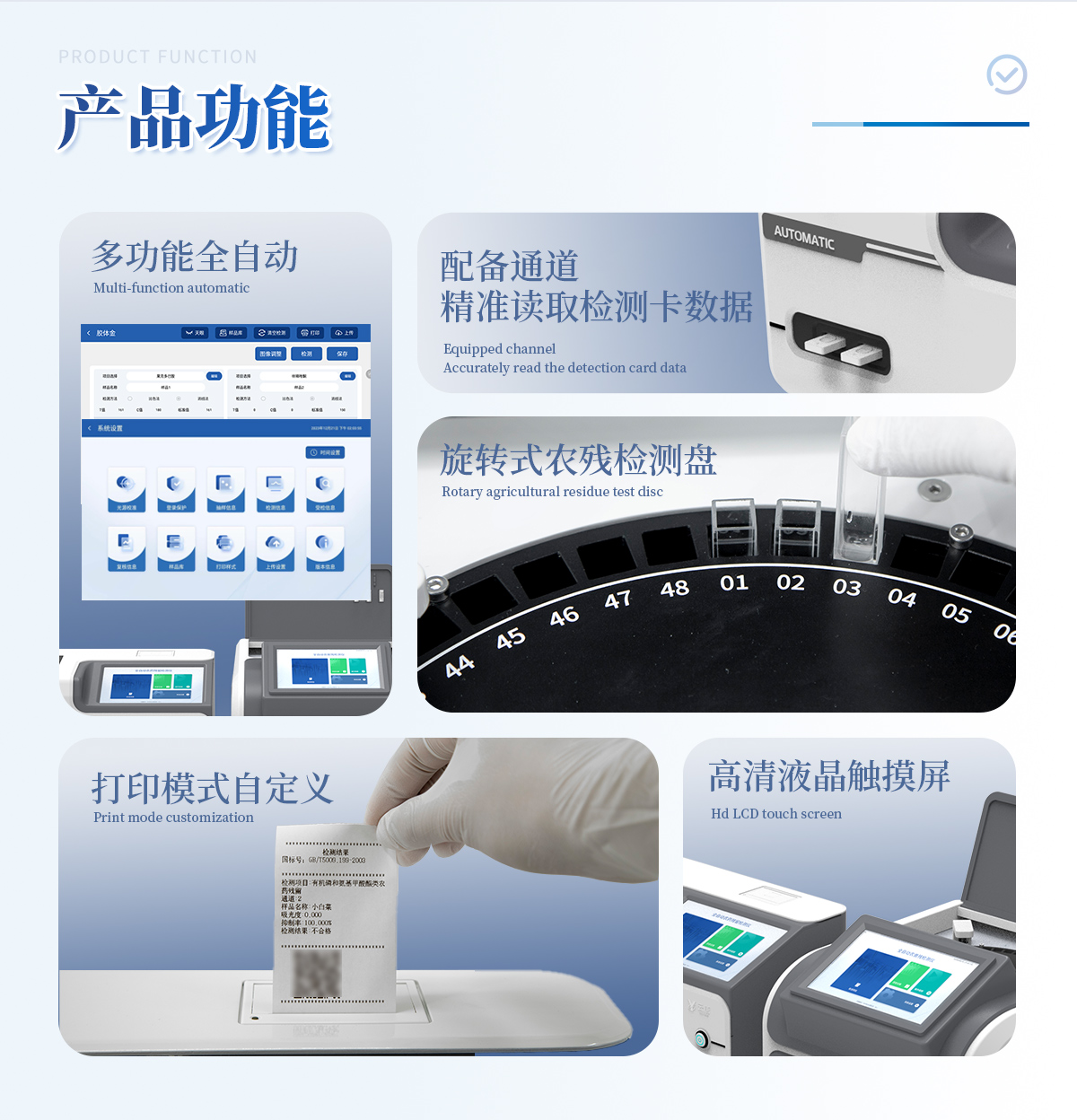 1. 試劑位置:3個2. 農殘檢測盤:旋轉48通道比色盤,可任意選擇檢測通道,自動對應選擇通道。3. 膠體金通道:6個單通道,1個三聯卡通道,可讀取檢測卡結果,自動采集、處理分析,自動判斷檢測結果,并具備自動判空功能。4.系統配置:10.1寸高清液晶觸摸屏,采用ARM Cortex-A7,RK3288/4核處理器,運行內存1GB。Android7.1.1 系統分辨率1280×800。5.恒溫系統:具有自動加溫溫控系統,精準恒溫37℃,精度±0.1℃。 6.添加系統:儀器按照試劑要求自動、按時、按量加入試劑,并且自動對未正常放置的樣本或異常的樣本進行檢查并提示。7.清洗功能:儀器具備回流及自動清洗管路功能,避免試劑污染。8.混勻功能:設備具備自動混勻功能。9.光源校準:設備可自動校準,確保檢測準確度。10.實時監控:儀器測試過程中屏幕顯示運行狀態,可實時查看。11.數據存儲:內部存儲16GB,可存儲500萬條數據。12.樣品多選功能:設備具備樣品一鍵多選功能,選擇樣品自動匹配檢測通道。13.項目預設:可提前設置單個及多個相同或不相同的檢測任務,可單次或者多次調取,減少檢測時間。14.自定義打印系統:內置自定義打印系統,可按需靈活設置開啟或關閉:產品合格證(國家農業部標準),二維碼,抽樣信息、檢測信息,受檢信息等信息的打印。15.A4版本報告打印功能:設備可自動生成A4版報告,A4報告帶二維碼,可掃描二維碼生成電子版,并可識別真偽。16.傳輸方式:儀器配備無線通信模塊: 4G(APN)通訊模塊、Wifi模塊,藍牙傳輸模塊,同時具有USB接口以及RJ45接口能以多種方式實現數據保存和數據傳輸功能,設備數據可以同步上傳至平臺。17.數據監管系統:設備自帶監管平臺,并可同步對接監管平臺,數據可局域網和互聯網數據上傳,檢測結果可直接傳至食品安全監管平臺。達到食品安全問題預估、預警。18.系統遠程更新功能:無需設備返廠,即可遠程實時升級全新系統,節省時間成本及避免運輸造成設備損。