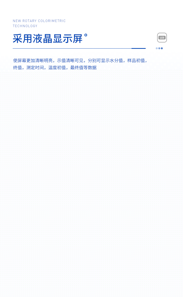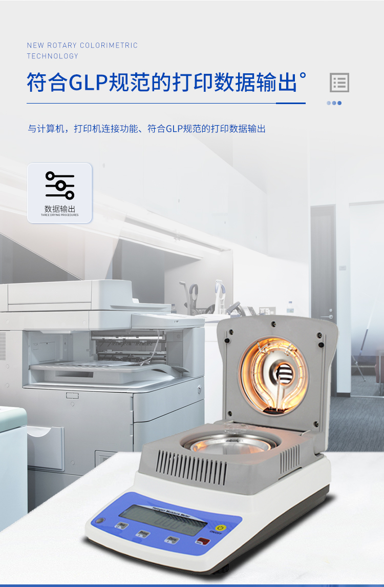 環狀的鹵素燈確保樣品得到均勻加熱,操作簡便、測量準確。水分測定儀在測量樣品重量的同時,儀器采用環形管鹵素加熱方式,快速干燥樣品,在干燥過程中,水分儀持續測量并即時顯示樣品丟失的水分含量%,干燥程序完成后,*終測定的水分含量值被鎖定顯示。與國際烘箱加熱法相比,鹵素加熱可以在高溫下將樣品均勻地快速干燥,樣品表面不易受損,其檢測結果與國標烘箱法具有良好的一致性,具有可替代性,且檢測效率遠遠高于烘箱法。智能化操作,一般樣品只需幾分鐘即可完成測定。該儀器操作簡單,測試準確,顯示部分采用液晶顯示屏-使屏幕更加清晰明亮,示值清晰可見,分別可顯示水分值,樣品初值,終值,測定時間,溫度初值,*終值等數據,并具有與計算機,打印機連接功能、符合GLP規范的打印數據輸出。
