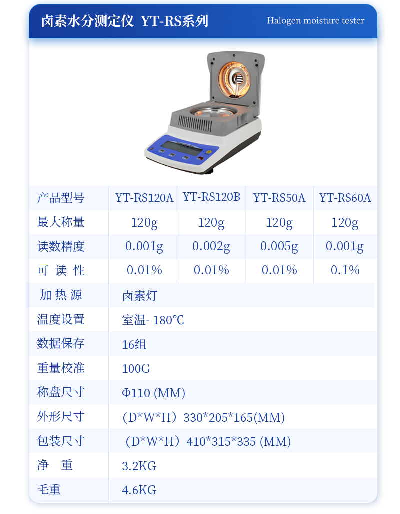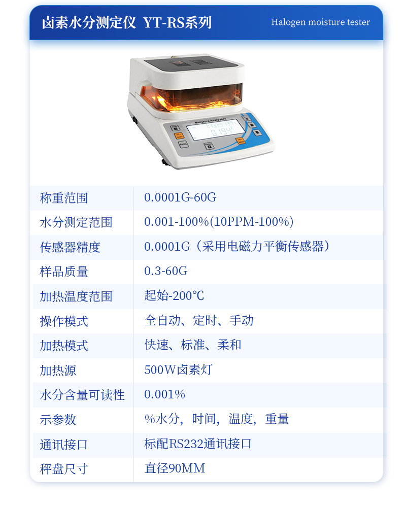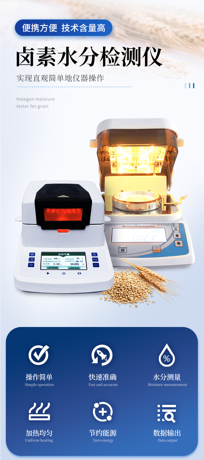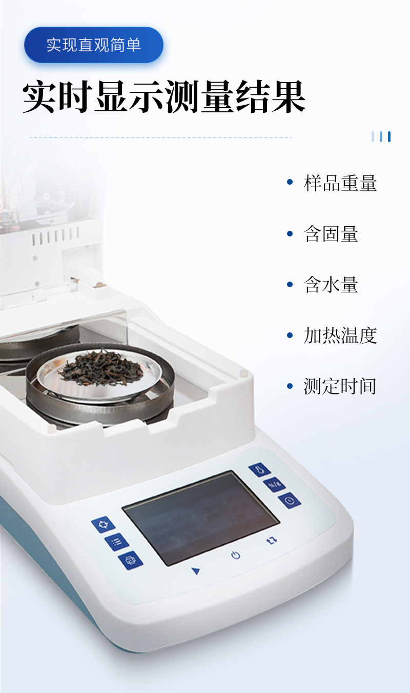 環狀的鹵素燈確保樣品得到均勻加熱,操作簡便、測量準確。鹵素水分測定儀在測量樣品重量的同時,儀器采用環形管鹵素加熱方式,快速干燥樣品,在干燥過程中,水分儀持續測量并即時顯示樣品丟失的水分含量%,干燥程序完成后,*終測定的水分含量值被鎖定顯示。與國際烘箱加熱法相比,鹵素加熱可以在高溫下將樣品均勻地快速干燥,樣品表面不易受損,其檢測結果與國標烘箱法具有良好的一致性,具有可替代性,且檢測效率遠遠高于烘箱法。智能化操作,一般樣品只需幾分鐘即可完成測定。該儀器操作簡單,測試準確,顯示部分采用液晶顯示屏-使屏幕更加清晰明亮,示值清晰可見,分別可顯示水分值,樣品初值,終值,測定時間,溫度初值,*終值等數據,并具有與計算機,打印機連接功能、符合GLP規范的打印數據輸出。