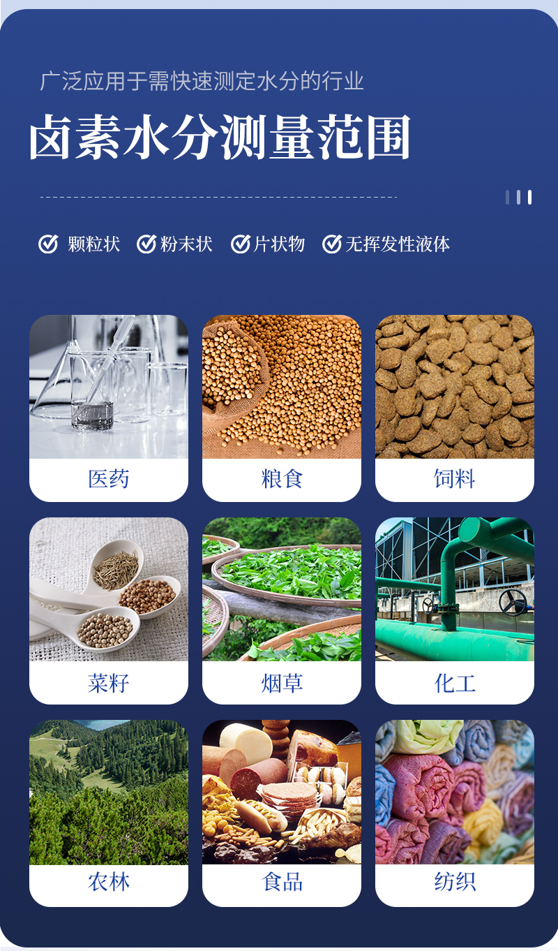 可廣泛應用于一切需要快速測定水分的行業,如醫藥,糧食、飼料、種子,菜籽,脫水蔬菜、煙草,化工,茶葉,食品、肉類以及紡織,農林、造紙、橡膠、塑膠、紡織等行業中的實驗室與生產過程中。同時滿足固體、顆粒、粉末、膠狀體及液體含水率的測定要求