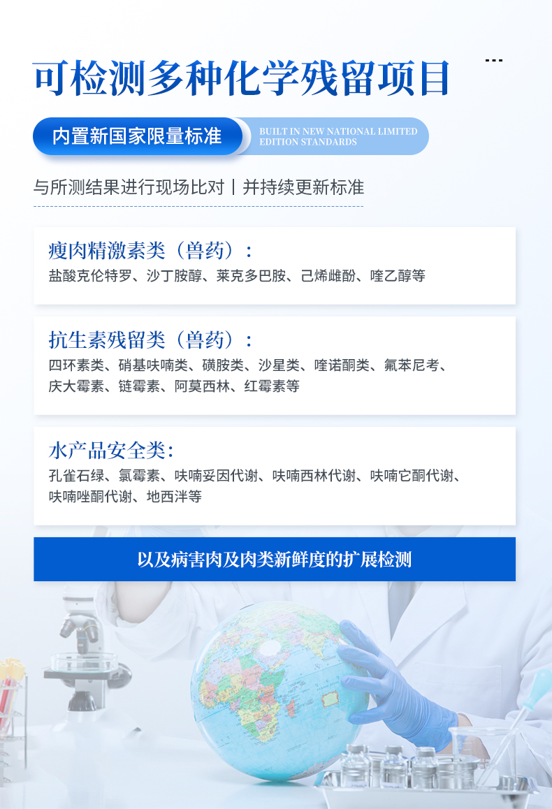 3.☆檢測項目:可檢測農藥殘留、食品添加劑、色素、可現場快速檢測農藥殘留、鹽酸克倫特羅、沙丁胺醇、萊克多巴胺、四環素類、硝基呋喃類、磺胺類、沙星類、氯霉素、孔雀石綠磺胺類,并且可以連接食品安全監控系統。