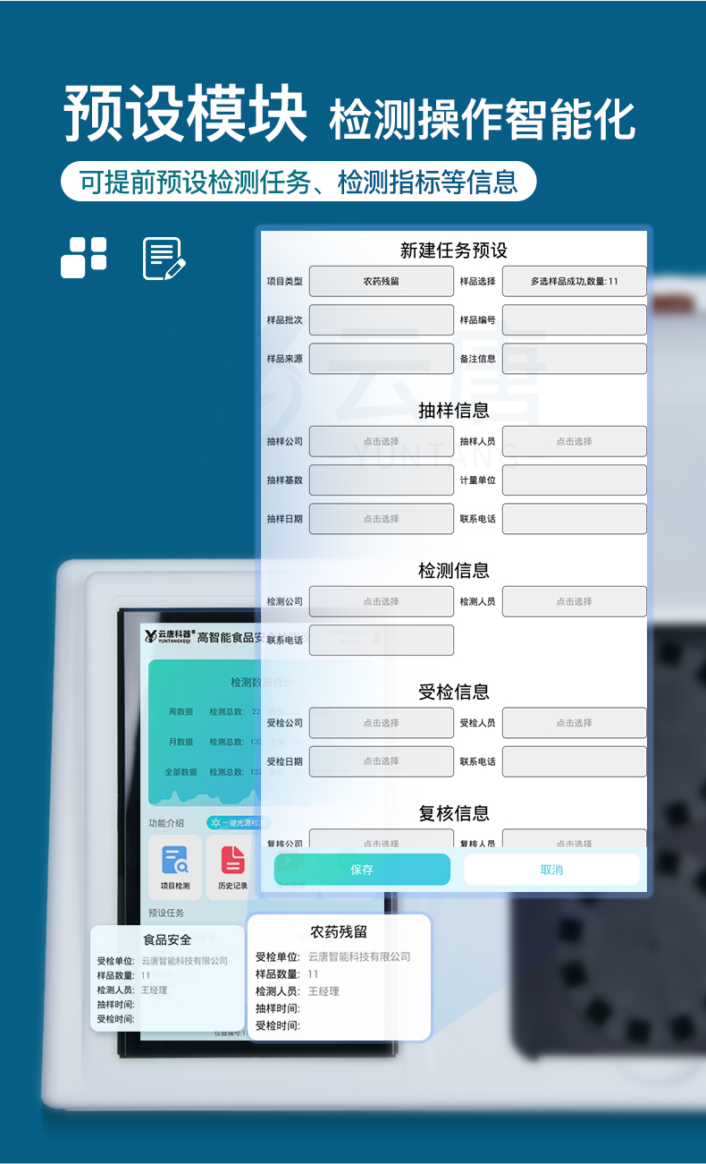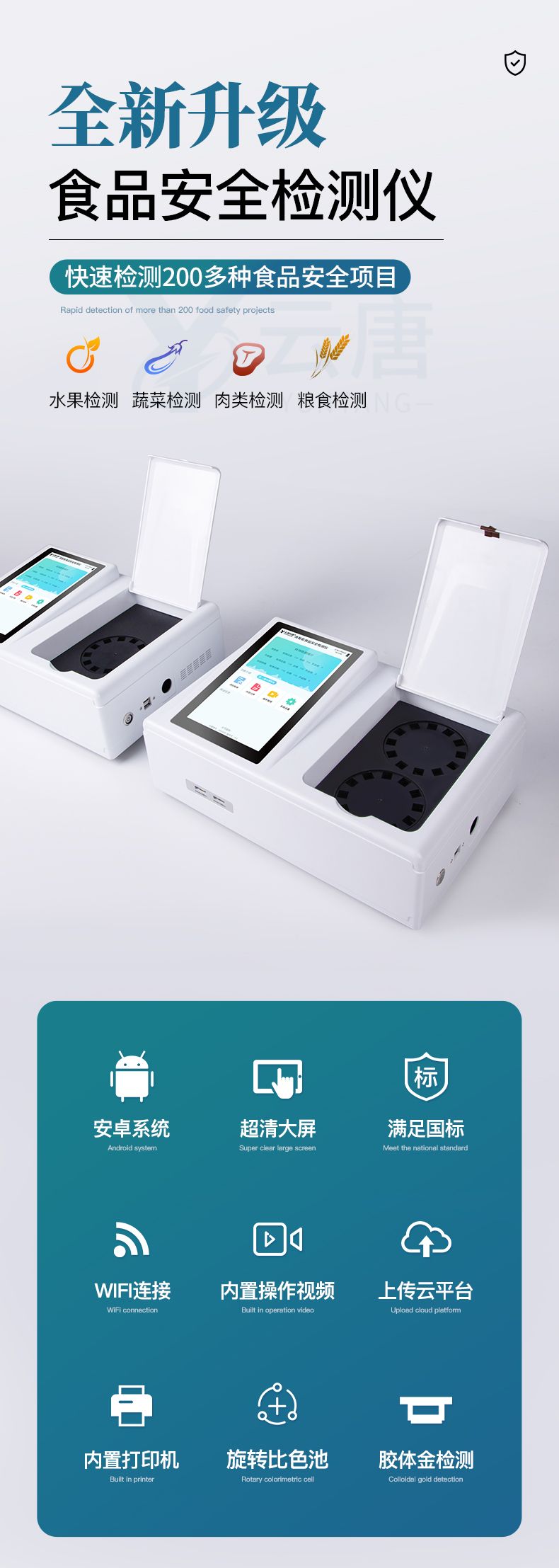 山東云唐智能科技有限公司生產(chǎn)的食品安全綜合分析儀為集成化食品安全快速檢測(cè)分析設(shè)備,采用臺(tái)式一體化設(shè)計(jì),可快速檢測(cè)200多種食品安全項(xiàng)目,包含非食用化學(xué)物質(zhì)、濫用食品添加劑、農(nóng)藥殘留、獸藥殘留、重金屬、病害肉、營(yíng)養(yǎng)強(qiáng)化劑、抗生素類殘留、激素類殘留、真菌毒素類殘留、化學(xué)類殘留等項(xiàng)目的定性定量檢測(cè)。