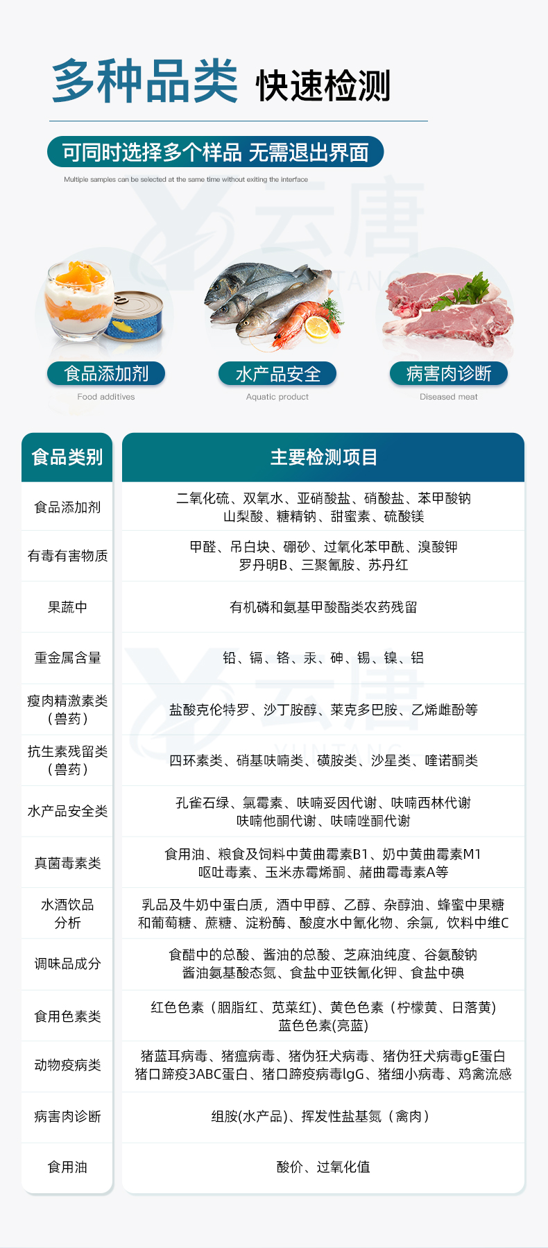 山東云唐智能科技有限公司生產(chǎn)的高智能食品安全檢測儀為集成化食品安全快速檢測分析設備,采用臺式一體化設計,可快速檢測200多種食品安全項目,包含非食用化學物質(zhì)、濫用食品添加劑、農(nóng)藥殘留、獸藥殘留、重金屬、病害肉、營養(yǎng)強化劑、抗生素類殘留、激素類殘留、真菌毒素類殘留、化學類殘留等項目的定性定量檢測。