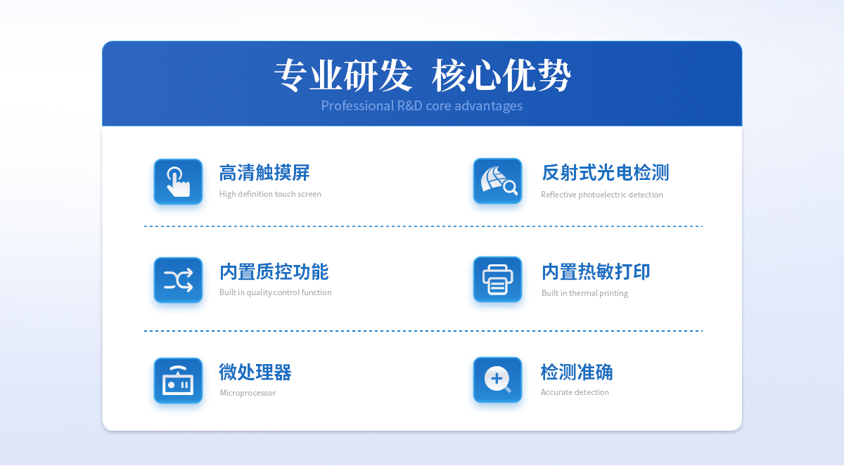 | 1、 手持式設計,電池供電,緊湊輕便,兼顧移動檢測需求 | 2、 Android4.4系統,界面友好,操作簡單流暢,無需外接設備; | 3、 8G超大容量內存,支持按日期靈活查詢、預覽、刪除結果,并生成多樣化專業報告。 | 4、 高精度光學系統:采用特定波長光源和光電傳感器,減少環境光干擾。 | 5、 二維碼掃描錄入樣本信息,避免人工錯誤 | 6、 內置熱敏打印機,檢測完成即可現場打印標準報告,提升工作效率。 | 7、 關鍵部件實時自診斷功能,保障儀器長期穩定運行。 | 8、 無線網絡及藍牙,構建完善的數據監控平臺,實現數據實時上傳、遠程查詢、統計分析和監管協同。 | 9、 通道內置孵育模塊,為特定試紙條反應提供**溫度環境。 | 10、 支持多種品牌/類型的金標試紙條 | 1、 插卡判斷:檢測卡未插入檢測通道不能檢測 | 11、 內置質控功能,可設備送檢、設備自檢、試劑卡自檢 | 12、 檢測方式:孵育檢測、即時檢測(對檢測數據復檢核實) | 13、 檢測曲線:可以對試劑卡的檢測核驗,防止誤判。 | 14、 檢測結果:報告出檢測項目、被測物質的結果、檢測單位、被檢查單位、檢驗員、檢測時間、檢測限等信息可在觸摸屏上顯示,可通過儀器內置打印機輸出 | 15、 項目管理:支持項目拓展 | 16、 界面設置:可修改標題和頁尾信息,靈活展示儀器信息 |