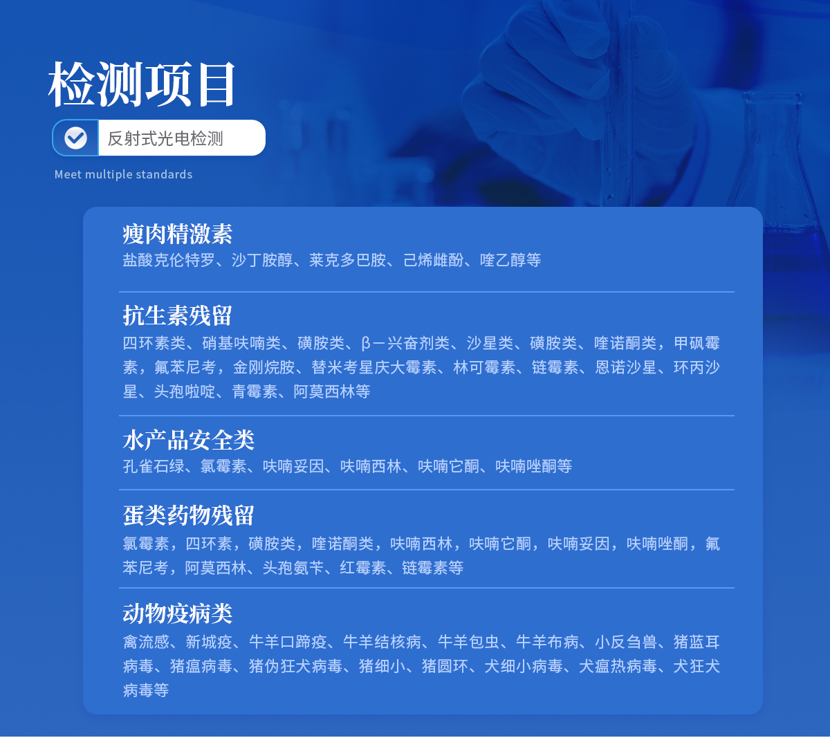 | 1、瘦肉精激素:鹽酸克倫特羅、沙丁胺醇、萊克多巴胺、己烯雌酚、喹乙醇等 | 2、 抗生素殘留:四環素類、硝基呋喃類、磺胺類、β-興奮劑類、沙星類、磺胺類、喹諾酮類,甲砜霉素,氟苯尼考,金剛烷胺、替米考星、慶大霉素、林可霉素、鏈霉素、恩諾沙星、環丙沙星、頭孢啦啶、青霉素、阿莫西林等 | 3、 水產品安全類:孔雀石綠、氯霉素、呋喃妥因、呋喃西林、呋喃它酮、呋喃唑酮等 | 4、蛋類藥物殘留 氯霉素,四環素,磺胺類,喹諾酮類,呋喃西林,呋喃它酮,呋喃妥因,呋喃唑酮,氟苯尼考,阿莫西林、頭孢氨芐、紅霉素、鏈霉素等 | 5、 動物疫病類:禽流感、新城疫、牛羊口蹄疫、牛羊結核病、牛羊包蟲、牛羊布病、小反芻獸、豬藍耳病毒、豬瘟病毒、豬偽狂犬病毒、豬細小、豬圓環、犬細小病毒、犬瘟熱病毒、犬狂犬病毒等 |