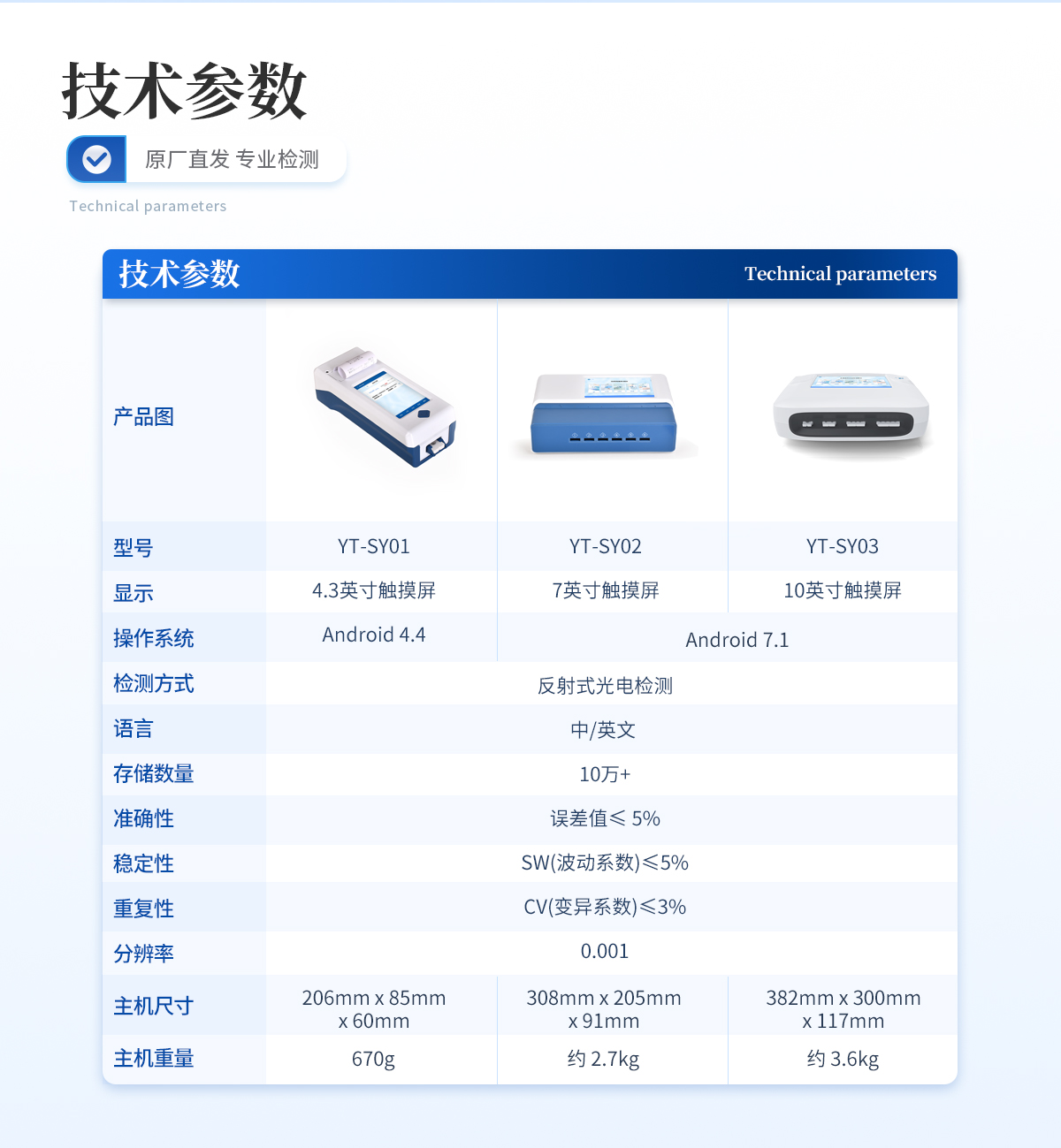 | 2、 屏幕:4.3英寸觸摸屏,分辨率:800*480,內部存儲:1+8GB | 3、 操作系統:Android:4.4 | 4、 檢測方式:反射式光電檢測 | 5、 適配卡殼:70mm*20mm | 6、 語言:中/英文: | 7、 存儲數量:10萬+ | 8、 準確性:誤差值≤:5% | 9、 穩定性:SW(波動系數)≤:5% | 10、重復性:CV(變異系數)≤:3% | 11、分辨率:0.001 | 12、檢測通道:單通道 | 13、檢測時間:<:5秒;可對樣本進行膠體金定性> | 14、數據傳輸:WiFi、藍牙、Type-C | 15、數據處理:可通過通訊端口進行數據匯總、上傳監管平臺等 | 16、檢測通道孵育檢測一體,溫度范圍::室溫:+5℃:~:60℃ | 17、打印機:熱敏打印機(熱敏打印紙:57*20mm) | 18、電源:輸入AC100V-240V/0.3A 50Hz;輸出DC5V/2A | 19、電池容量:6000mah: | 20、顯示電量 | 21、使用環境:溫度:0~50℃;濕度:0~90%: | 22、主機尺寸::206mm*85mm*60mm | 23、主機重量:670g |
