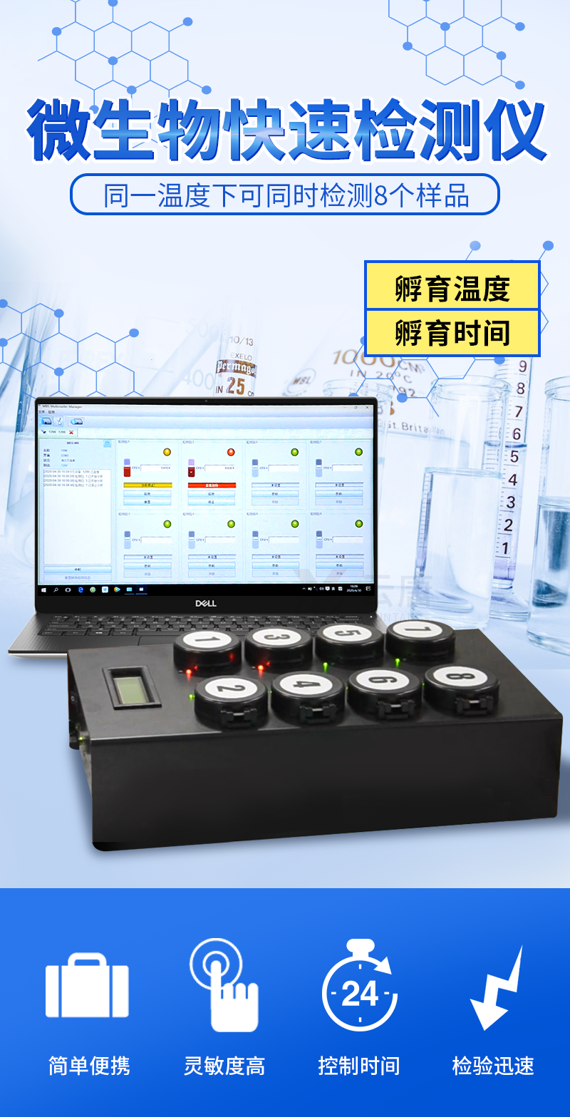 | 1. MBS微生物快速檢測系統(tǒng),可以對固體、液體、食品、水(飲用水、地表水、廢水、工業(yè)用水等)和物體表面進(jìn)行微生物分析,只需使用一個容器,就可以節(jié)省技術(shù)、成本和時間: | 2. 速度快:無需預(yù)處理,比傳統(tǒng)方法快2到5倍 ; | 3. 使用簡單:任何人都可以在沒有任何試劑或儀器的情況下進(jìn)行分析,可現(xiàn)場檢測無需實(shí)驗(yàn)室環(huán)境; | 4. 敏感性強(qiáng):可分析樣本中的任一單個細(xì)胞,特異性達(dá)到99.999%; | 5. 適用性廣:可以分析樣品中99.9%的細(xì)菌種類; | 6.費(fèi)用低 :比傳統(tǒng)的分析方式便宜2到4倍; |