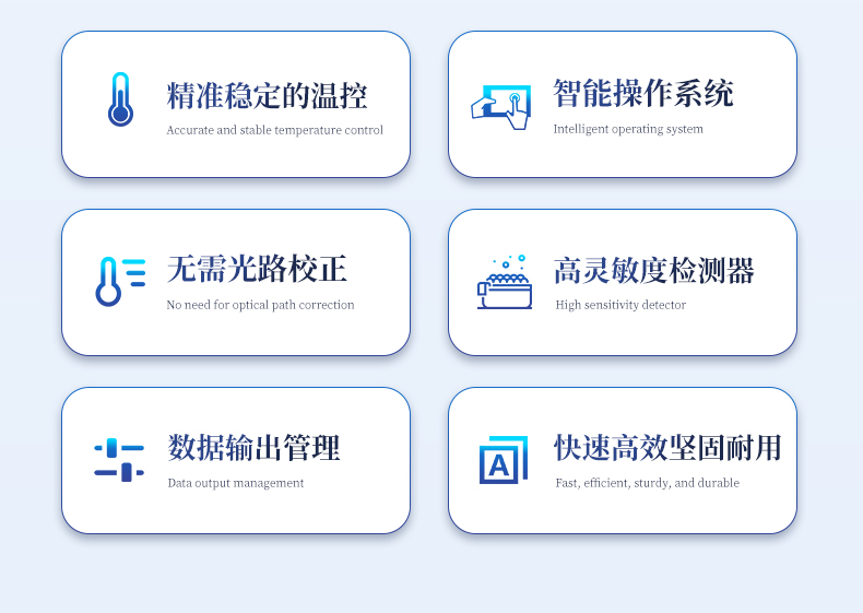 | 1.智能操作系統,實驗盡在掌握 | A雙模式靈活控制:支持通過儀器觸摸屏獨立運行,也支持通過電腦軟件進行遠程控制與數據管理,適應不同實驗場景需求。 | B程序更新與預設:支持在線更新實驗程序,并內置豐富的預設實驗程序模板,用戶亦可自定義保存常用模版,實現一鍵快速啟動,極大提升操作效率。 | C極簡啟動體驗(可選配):可定制集成攝像頭掃描系統,用戶只需掃描樣品板或程序卡的二維碼,即可自動識別并調用對應實驗程序,簡化流程,避免人為設置錯誤。 | D操作簡單:無論是觸摸屏界面還是電腦軟件,均設計得直觀易懂,新用戶也能快速上手。預置常用程序模板,進一步簡化操作流程。 | 2.精準穩定的溫控與光學核心 | A長久精準的溫控系統:采用進口***TEC半導體制冷模塊,控溫精準(±0.1°C),孔間溫度均勻性**(≤±0.3°C)。系統穩定性卓越,長期使用性能衰減小,校準周期長達數年,顯著降低維護成本與運營中斷。 | B免維護的靈敏光學系統:配備4個獨立LED光源與4個獨立光電二極管檢測器,實現四通道熒光同步精準檢測。采用超長壽命進口光源,設計壽命期內免維護,無需額外校準或更換,保障檢測結果長期一致性與高靈敏度。 | C卓越的數據質量:實驗線性相關性高(R2≥0.999),重復性優異(孔間CV值低),確保定量結果準確可靠,數據置信度高。 | 3.**便捷的數據與輸出管理 | A多重數據導出方式:支持通過USB存儲設備直接拷貝,或經由Wi-Fi無線網絡傳輸數據至本地服務器或云端,方便靈活,滿足各類實驗室數據管理習慣。 | B豐富的報告導出與打印:支持生成并導出多種格式(如PDF、Excel)的實驗報告。儀器兼容USB熱敏打印機、藍牙無線打印機及常規A4打印機,可直接在儀器上或通過電腦一鍵導出并打印專業報告,便于結果存檔與即時分享。 | 4.快速**與堅固耐用 | A升降溫速度快:優化設計的溫控系統具備高速升降溫能力,顯著縮短單次循環與整體檢測時間,提升實驗通量。 | B超長使用壽命:核心部件均選用工業級耐用材料與設計,整機運行穩定可靠,致力于為用戶提供長久的投資回報。 |